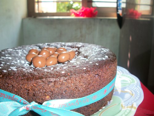 Pour this into the tin and bake it the oven for 1 ¾ – 2 hours. The cake looks little moist and sticky on top but has some moist texture in the middle.