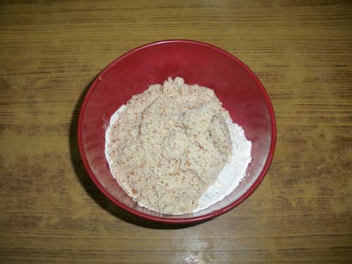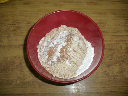 Break open 3 eggs in a bowl and mix it up. Take flour, powdered almond, baking powder, baking soda, cinnamon in a bowl and mix well. Set this both aside till ready to use.